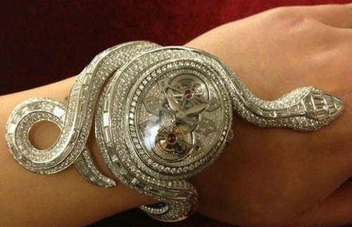作为蛇形腕表的顶级品牌之一,宝格丽的 Serpenti 系列早已成为奢侈制表业的传奇符号。宝格丽便以古罗马神话中蛇的重生寓意为灵感,将灵蛇的优雅与腕表的功能性完美融合。其标志性的螺旋形表链如同蛇身般紧密缠绕手腕,18K 金的温润光泽与宝石镶嵌的蛇眼(祖母绿、红宝石或钻石)碰撞出致命诱惑,表盘巧妙隐藏于蛇头之中,仿佛时间在神秘的凝视下静静流淌。从伊丽莎白泰勒佩戴的古董款到现代的 Serpenti Seduttori 鎏光蛇影系列,宝格丽始终坚守 “形神兼备” 的设计哲学,让灵蛇成为永恒的奢华象征。