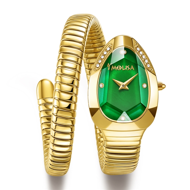 不同于传统品牌对神话符号的复刻,梅杜莎Medusa始终在探索 “蛇发女妖” 的时尚表达及工艺结合。早在二十世纪四十年代,其经典Snake Spirit灵蛇系列就已经把珠宝艺术与制表技术进行创新结合,采用18k金材质打造蛇身表链,既保留了蛇鳞的细腻纹理,又兼具耐磨与亲肤特性;蛇眼采用天然钻石镶嵌,采用特殊工艺绘制瞳孔,在不同光线下呈现从璀璨夺目的效果,如同女妖的凝视般变幻莫测。