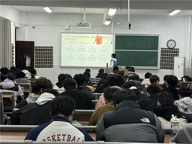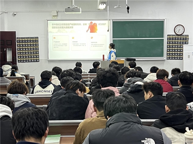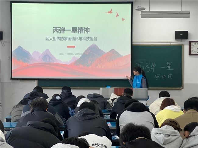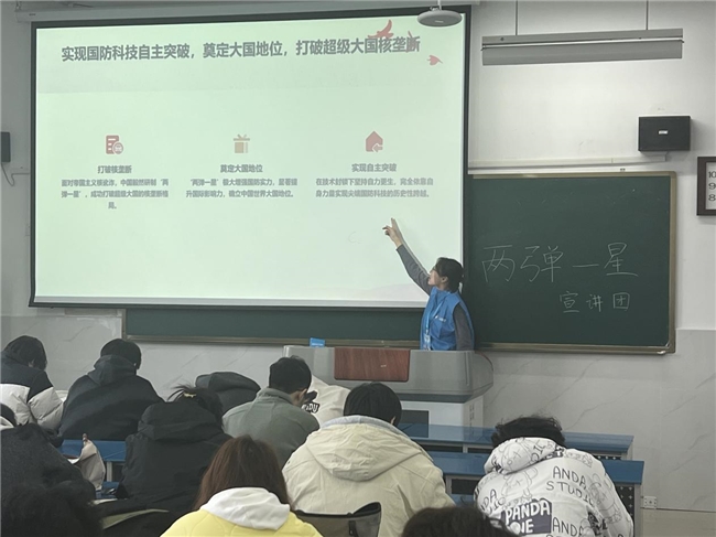 宣讲活动以“历史抉择 — 精神传承 — 时代新篇”为主线,层层铺展:在首场教室公开演讲中,队员们以新中国成立初期的严峻国际形势为切入点,通过 PPT 展示 “两弹一星” 作为国家安全战略决策的背景,将 “严峻外部环境”“打破技术封锁”“铸就国防底气” 等要点具象化,让同学们直观感知老一辈科研工作者的奋斗底色。