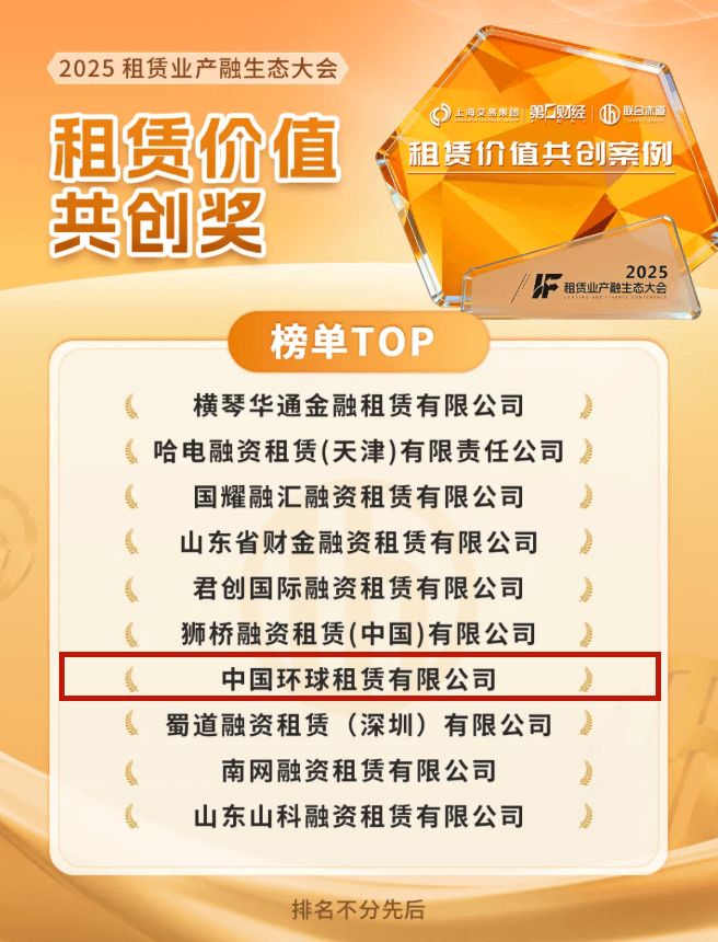近日,由第一财经、上海交易集团、联合资信、联合赤道共同编制的2025中国融资租赁综合质量典范、2025中国融资租赁ESG影响力典范评选结果重磅揭晓。通用技术环球医疗全资子公司——中国环球租赁有限公司凭借其在综合实力、专业能力与服务实体经济成效方面的优异表现,荣登“2025中国融资租赁机构(商租)综合质量典范”名单,成为全行业获此荣誉的15家标杆企业之一,并摘得“2025中国融资租赁ESG影响力典范·租赁价值共创奖”,体现了行业对公司在综合运营质量、产融协同实践,以及ESG行动方面的充分认可。