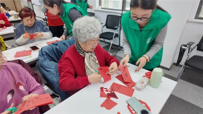 活动尾声,剪窗花环节为此次实践增添了浓厚的民俗气息。一张张承载着美好祝福的窗花在指尖绽放,既有传统民俗的韵味,更有邻里相伴的温情。志愿者们提前准备好圆头安全剪刀和专业红色剪纸,与老人们围坐在一起,共同创作。折纸、描线、裁剪……志愿者演示整体流程,并分步骤手把手辅助教学,老人们认真学习,不时互相展示作品,分享春节记忆。“福”字、梅花、生肖……欢声笑语中,一张张精美的窗花传递着浓浓的温情,也让老人们感受到了关爱与陪伴。