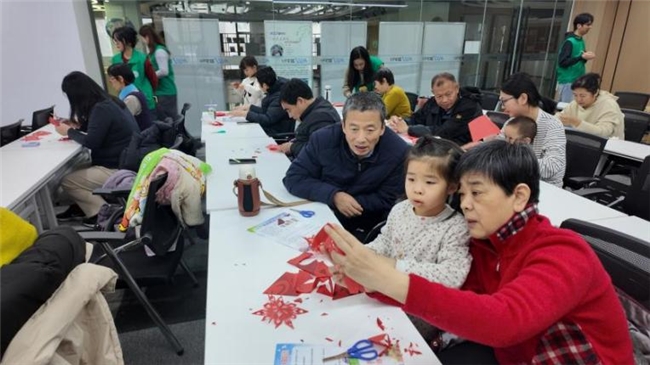 图为外国语学院译心惠民实践团与老人们一起剪窗花 张溢馨供图