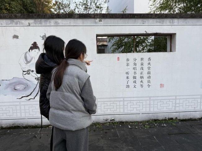 当日上午,探访团队乘车抵达东王村,沿着村内步道开启探访之旅。进入核心文化区域,特色墙面是为视觉焦点——斑驳的墙体上,既有通俗易懂、充满生活气息的打油诗图文,更系统镌刻着越剧经典台词选段、各类戏曲乐器的起源与发展历程。文字与墙体建筑相映成趣,形成一道兼具知识性与观赏性的文化长廊,让团队在移步换景间,便对越剧文化的基础脉络有了初步认知。