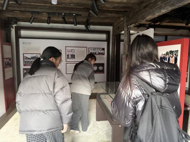 沿着文化长廊深入,村内的古戏台建筑群逐步显现。作为东王村越剧文化的核心载体,这里不仅保留着古色古香的戏台形制,更通过图文展板、实物陈列等,全方位呈现了越剧从起源、发展阶段、艺术特色,到越剧与党的发展历程之间的深厚渊源,成员们深刻体会到传统艺术在红色基因滋养下的生命力。途中展示的东王村合照,以具象化的场景,呈现了村落与越剧文化共生共荣的人文印记。